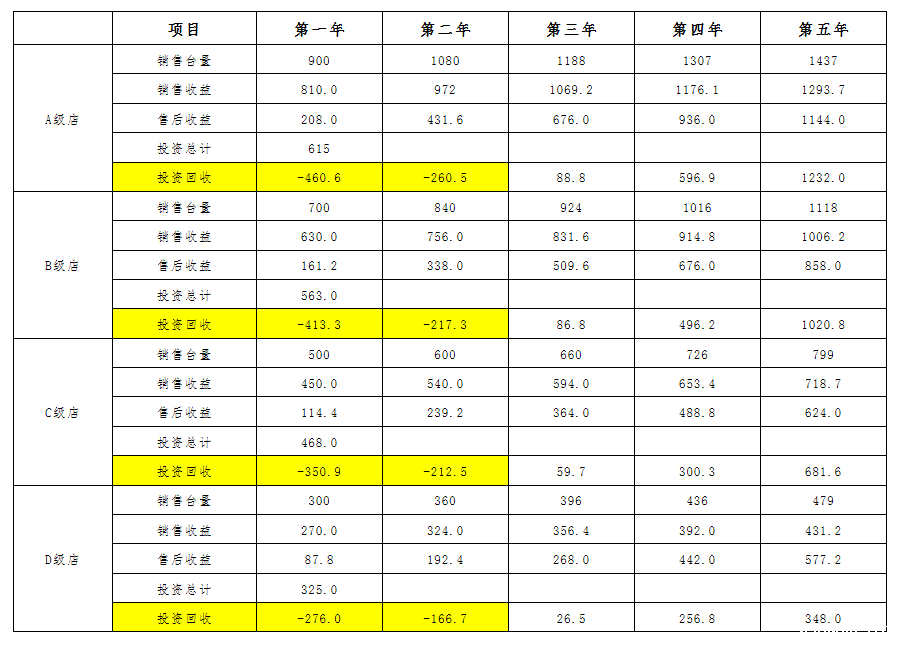 按照当时广汽三菱给到的商务政策和建店返利政策选取各大区平均数据测算,其销售渠道从A级到D级店,整体成本回收周期需在3年左右。但经销商若想要达到这一销量,也面临着不小的难度。