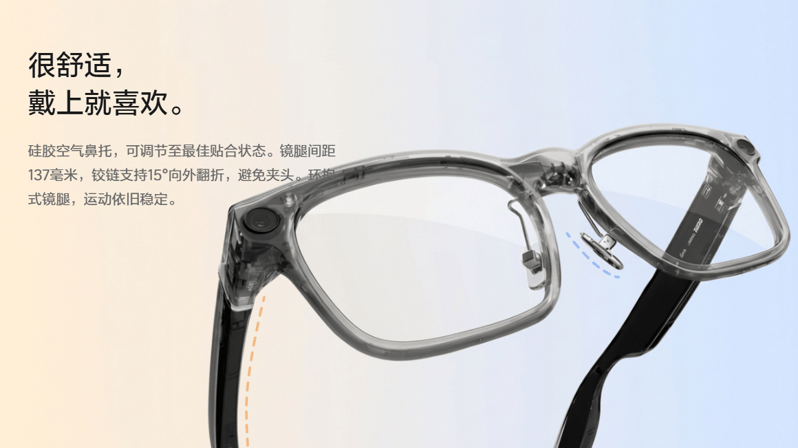 影像和音频体验同样可圈可点,1200万像素第一视角相机支持0.7秒闪电抓拍、105°超广角拍摄,配备EIS电子防抖和自动地平线矫正功能,LivePhoto模式还能记录拍照前后3秒的动态影像;开放式空间音频技术经过理想声学实验室调校,对称双磁路三明治扬声器搭配高性能功率放大器,在减少漏音的同时提供沉浸式听觉体验,兼顾隐私与质感。